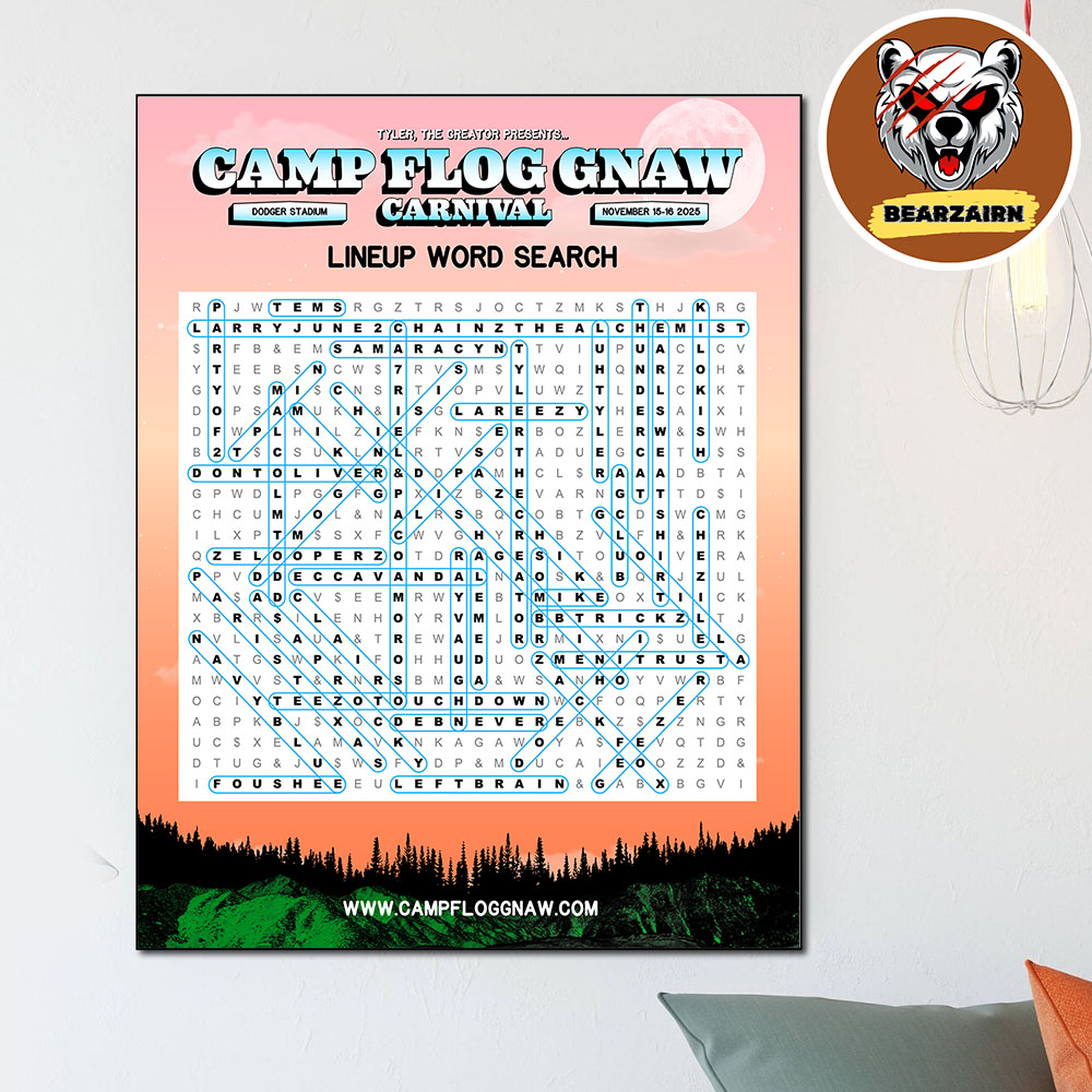 Bearzairn: About Camp Flog Gnaw Carnival 2025 Merch Poster Lineup Word Search At Dodgers Stadium On November 15 And 16 2025 Home Decor Poster Canvas Introduction