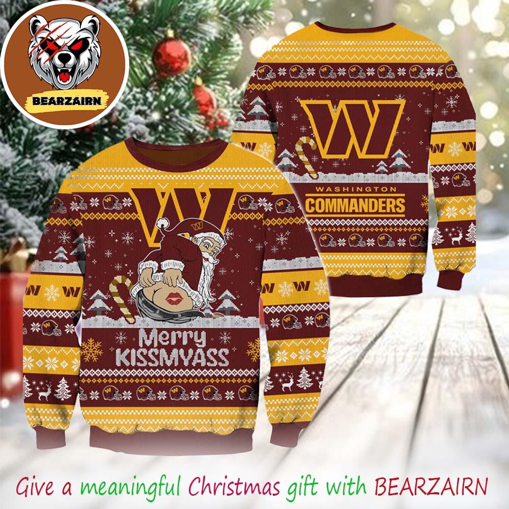 Turn up the holiday fun with the Washington Commanders NFL Merrykissmyass Funny Santa Claus 2025 Ugly Christmas Sweater — the perfect mix of festive humor, football pride, and bold holiday style. Designed with Santa Claus showing off his cheeky side and the hilarious “Merrykissmyass” slogan, this sweater instantly grabs attention and delivers non-stop laughs. The classic burgundy and gold Commanders colors shine through a festive pattern of snowflakes, footballs, and team logos, making it a must-have for any true Washington fan this Christmas.